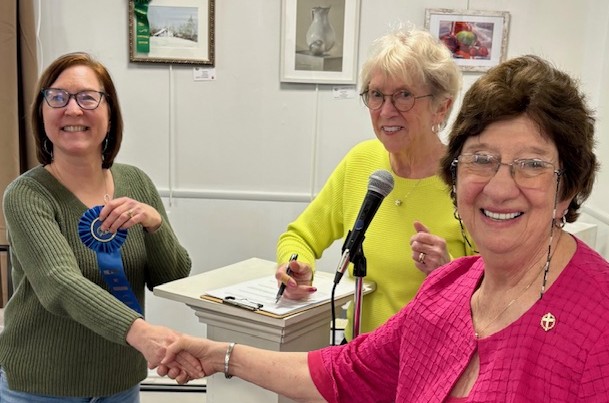 Lisa Melillo (on left) was presented the 1st Place Award by Gallery Director, Irene Bausmith and PSAA President Linda Saladino for her pastel artwork "Market Morning".