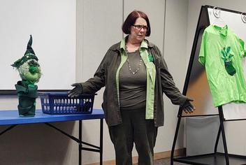 Here are photos from St. Patrick's Day... almost everyone was wearing green! Shelly is showing a sort of leprechaun and a tee shirt dressed up with other fabrics and mixed media additions.